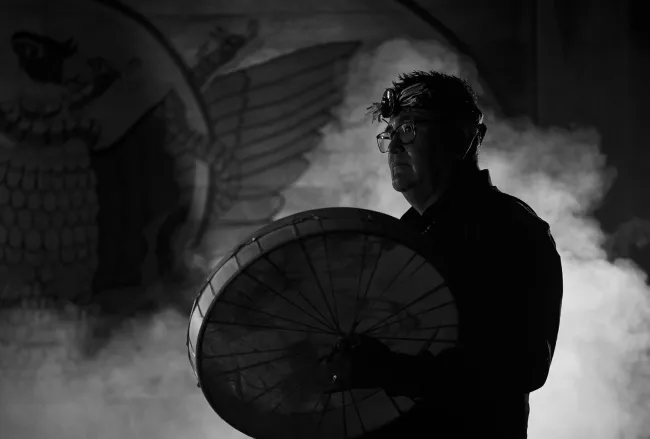 Traditionally, curtains have played an important role in story telling for First Nations on Vancouver Island. Following the Indian Act in 1885, family crest and stories that were once painted directly on the wood in homes were translated onto curtains as a way for families to share their stories at gatherings and potlatches without getting caught.