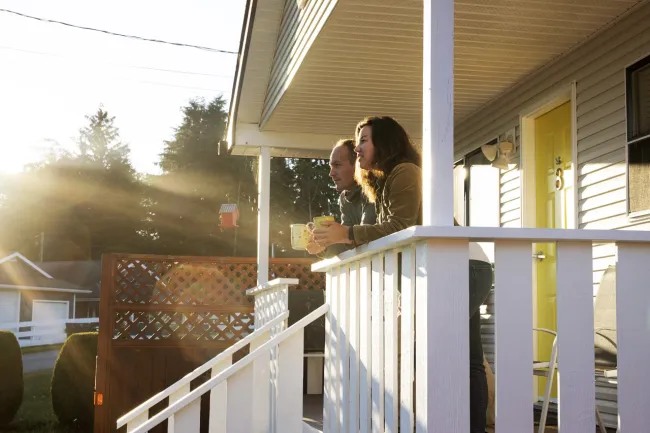 A couple enjoys coffee and whale watching from the deck of their cabin on Alert Bay.