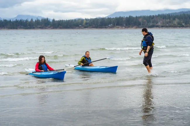 Launching kayaks from Tribune Bay Outdoor Education Centre, on Hornby Island.