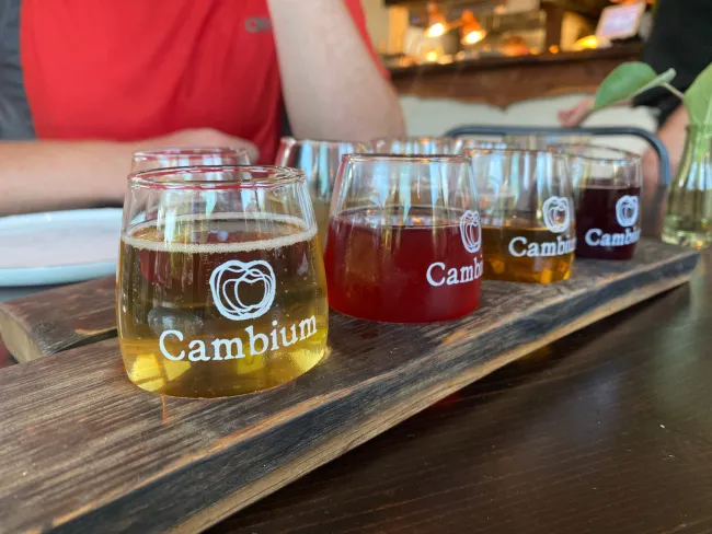 For the perfect end to a long day adventuring outside, we went from BX Falls to nearby Cambium Cider Co (previously The BX Press) for some dinner and to try a flight of their ciders, all of which are “Zero Food Miles,” as they grow all of their own apples, as well as pressing, fermenting and bottling all on site!