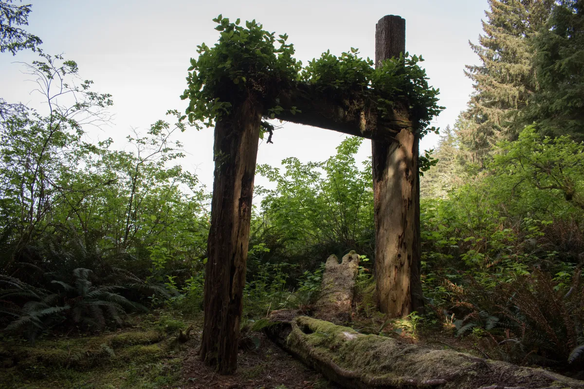 House posts are supported by nurse trees that have grown over their nursery logs, and the roots of salal berry bushes act as natural rebar, supporting the ancient structures. Fallen house posts and beams covered in moss could be mistaken for any other forest clutter, despite the fact there are so many, in such precise locations.