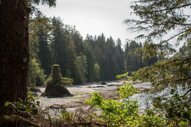 The trail head starts off in a gravel parking lot area, that leads down to a boardwalk traversing the coastal rainforest. The network of boardwalks open up to a lookout over a spectacular sandy beach where driftwood rolls up over bright green seagrass-covered boulders on the shore. That’s our route to find Kiixin.