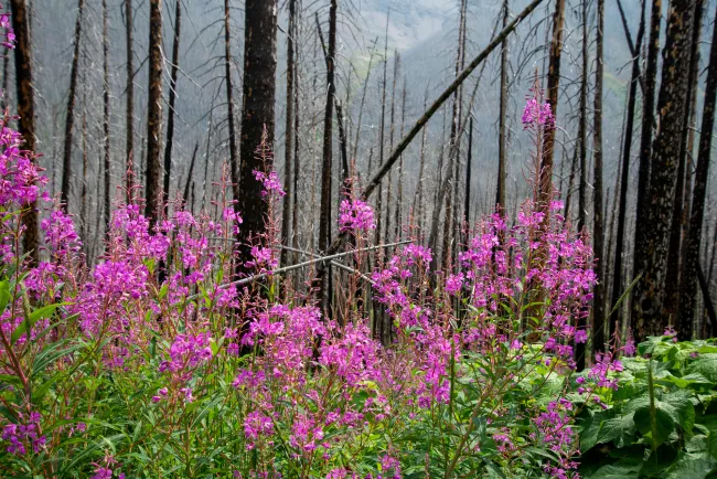 The lodgepole pine forest that once stood on these mountainsides are continuing with their natural life cycle, and after a burn, there is renewal of the forest.
