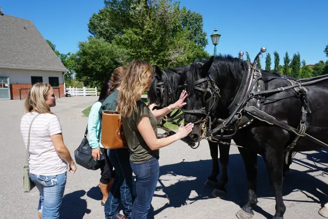 We had already spent hours exploring the property. However, our taste of the 19th-century wouldn't be complete without visiting the horses that moved the carriages forward. Another feature of the Remington Carriage Museum is the on-site stable, which is home to Clydesdales, quarter horses, and Canadians. Just by chance, we were lucky enough to witness workers creating and fitting horseshoes onto the horses. This does not happen every day here, and despite living in Alberta, this was the first time any of us had ever seen this. We watched them take off the old shoes, mold new ones, and then fit them onto the horse's hooves. We then moved outdoors to watch them demonstrate how to feed, clean, and harness a horse, before jumping into a carriage to go for a tour around the property.