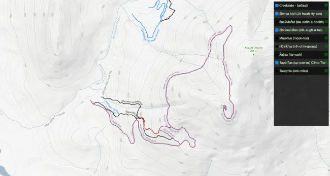 Yuułuʔiłʔatḥ - Ucluelet First Nation, Vancouver Island BC — As you pedal up to the mountain bike trails on Č̓umaat̓a (Mount Ozzard), just outside of Ucluelet, BC, a formidable new trail sign now welcomes you. On it, each of the nine trails is listed in Nuu-chah-nulth language, accompanied by its English translation.