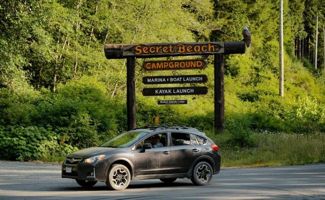 Access Secret Beach Campground & Kayak Launch just off Highway 4—look for the sign in this picture, noting that the campground is accessed by a 14 kilometer maintained gravel road.