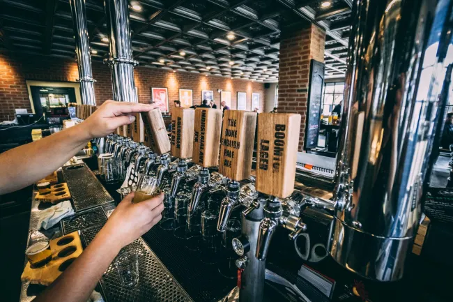 What caught my eye was the detail of the restaurant and tap room design, with an industrial-ish look. Again, those red brick walls (you’ll see lots of it here thanks to the I-XL brick plant, around since 1886). The tin ceiling with ornate detail and the rich woods invite you to sit back and relax. The bar is home to one of the longest tap handle lineups I’ve probably ever seen.